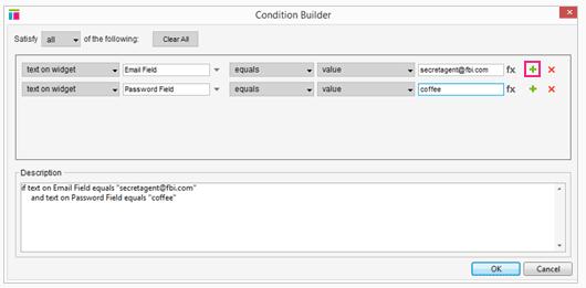 单击绿色的+图标添加第二个条件。设置第二行条件为“如果文本小部件密码字段等于咖啡”。