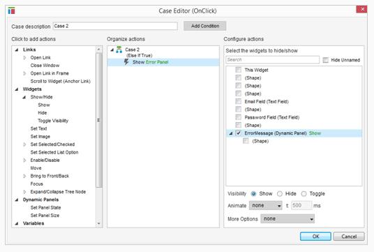 当登录不成功,我们想要展示错误信息小部件。在 Case 编辑器中,单击“显示”添加操作,勾选错误信息复选框。