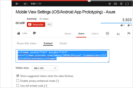 您也许还需要点击多一些按钮(例如在上图中的 “Embed”)来获得代码。你所需要的代码应以 <iframe 开头,找到整段代码并复制下来。
