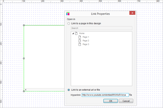 回到 Axure 并且双击在设计区域中的内联框架小部件。点击 Link to an external URL or file(链接到外部 URL 或文件)的单选框,然后粘贴之前复制下来的代码。