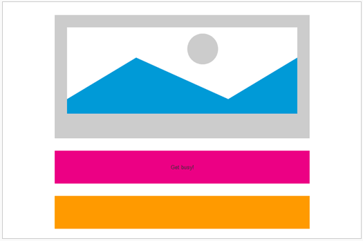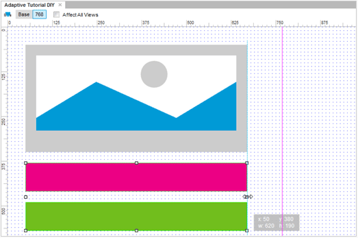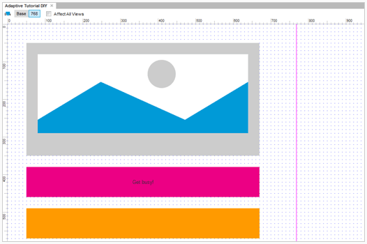 选择粉红色的矩形,并添加文本“Get busy!”。注意文本将被添加到基础视图和 768 视图。不同于样式属性,文本的更改应用于所有的视图。