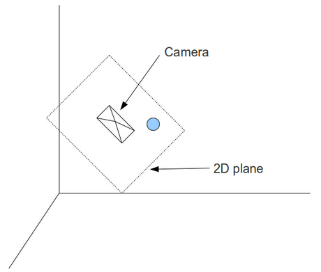 上面的例子很简单,因为相机的方向已经沿着 Z 轴负方向,并且通常相机的朝向都是沿着坐标轴的。但是如果相机指向其他方向将会发生什么呢?看下面的图片。简单的说,这是一个 2D 坐标系统,我们沿着 Y 轴的负方向观察。