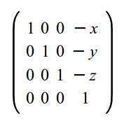 移动相机是非常简单的。如果相机位于(x,y,z),那么平移变换就是(-x,-y,-y)。原因很明显——相机在世界坐标系下用向量(x,y,z)做平移变换,所以想要将相机移动回原点,那么我们就可以使用此向量的相反向量进行平移。变换矩阵如下所示: