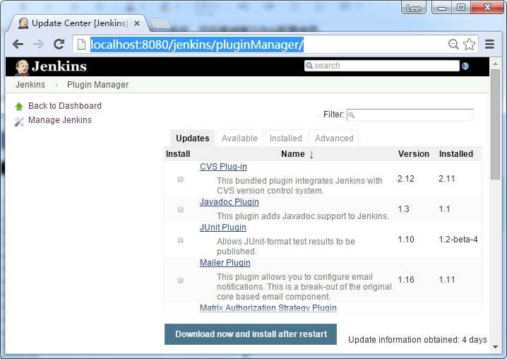 在这里,人们可以安装各种各样的插件,从不同的源代码管理工具,如Git, Mercurial 或 ClearCase等第三方插件,代码质量和代码覆盖度量报告。插件可以通过管理插件屏幕安装,更新和删除。访问:http://localhost:8080/jenkins/pluginManager/ 显示结果如下: