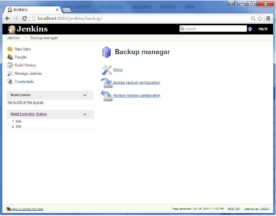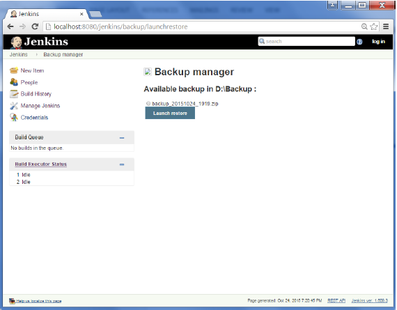 若要从备份中恢复,进入备份管理器屏幕上,点击 Restore Hudson configuration。