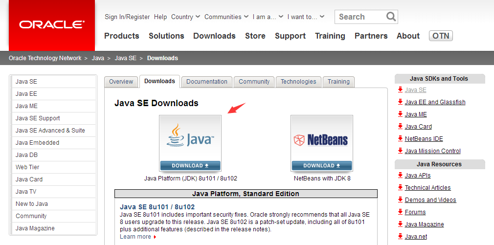首先我们需要下载java开发工具包JDK,下载地址:http://www.oracle.com/technetwork/java/javase/downloads/index.html,点击如下下载按钮: