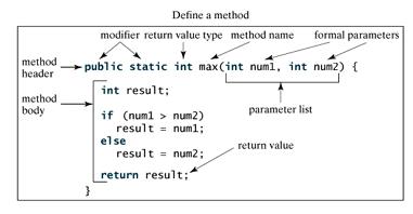 int larger = max(30, 40);如果方法返回值是void,方法调用一定是一条语句。例如,方法println返回void。下面的调用是个语句: