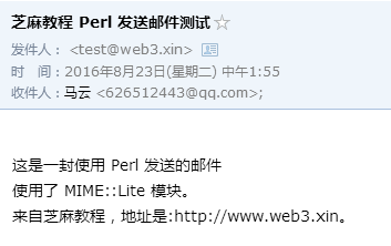#!/usr/bin/perl # 接收邮箱,这里我设置为我的 QQ 邮箱,你需要修改它为你自己的邮箱 $to = '626512443@.com'; #发送者邮箱 $from = 'test@web3.com'; #标题 $subject = '芝麻教程 Perl 发送邮件测试'; $message = '这是一封使用 Perl 发送的邮件。'; open(MAIL, "|/usr/sbin/sendmail -t"); # 邮件头部 print MAIL "To: $to\n"; print MAIL "From: $from\n"; print MAIL "Subject: $subject\n\n"; # 邮箱信息 print MAIL $message; close(MAIL); print "邮件发送成功\n";执行以上程序,输出结果为: