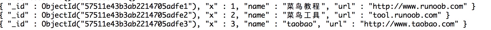 这里我们将三个网址数据插入到 test 数据库的 sites 集合,并读取迭代出来: